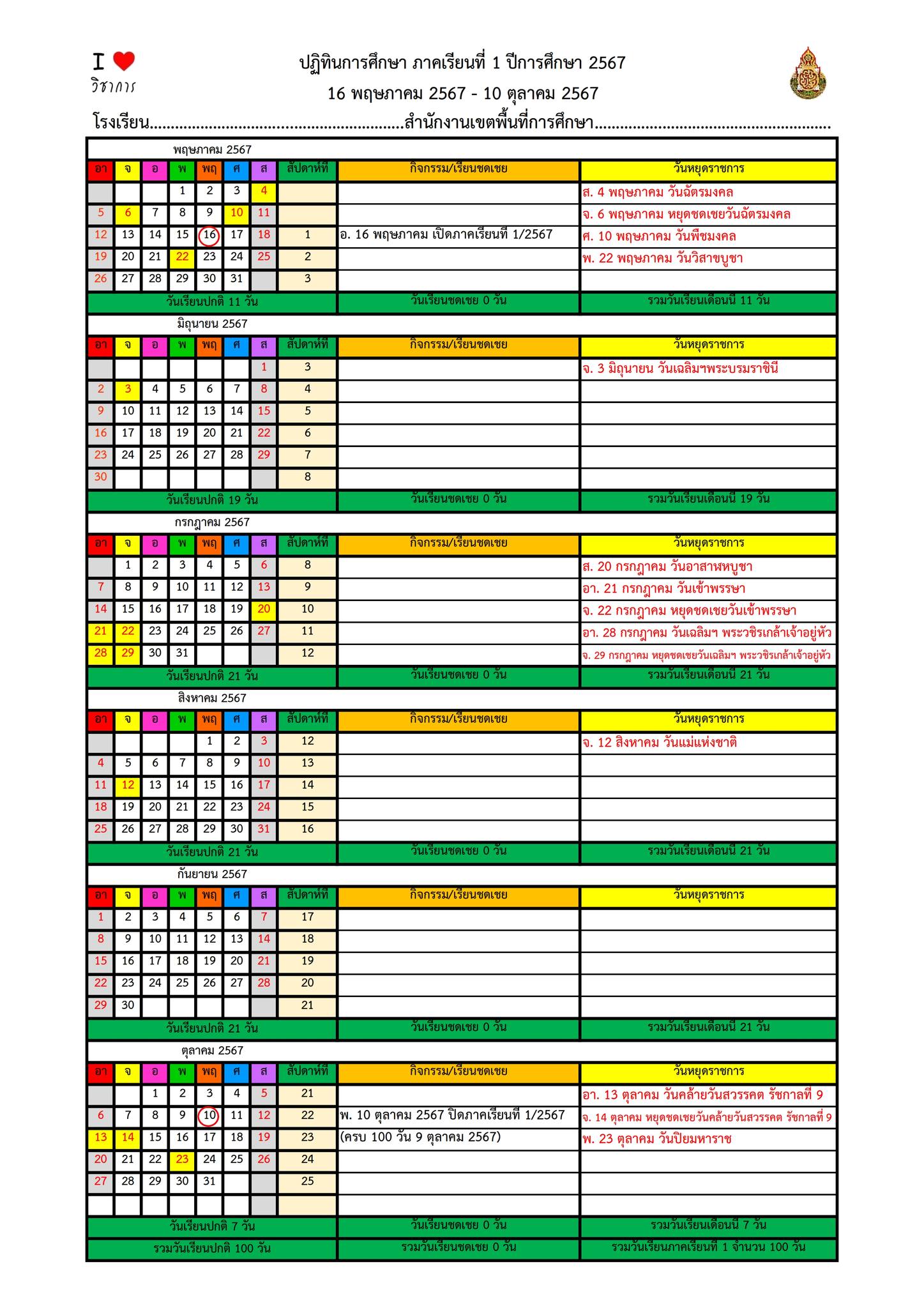 ปฏิทินกิจกรรม ภาคเรียนที่ 1