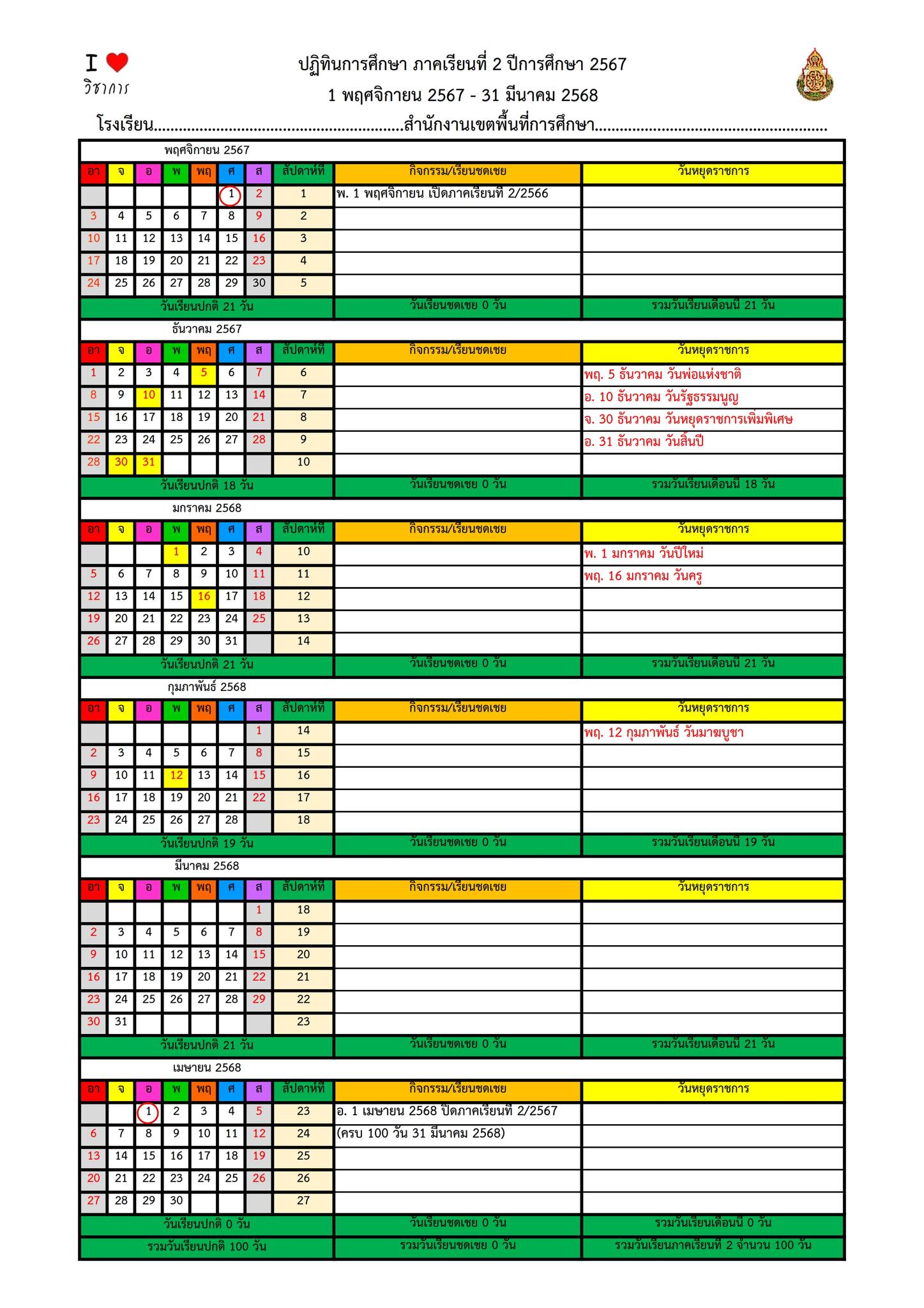 ปฏิทินกิจกรรม ภาคเรียนที่ 2